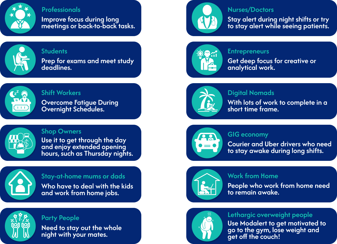 Modalert 200 mg tablets are typically prescribed to manage excessive sleepiness associated with narcolepsy, obstructive sleep apnea, and shift work sleep disorder. Reported benefits may include: